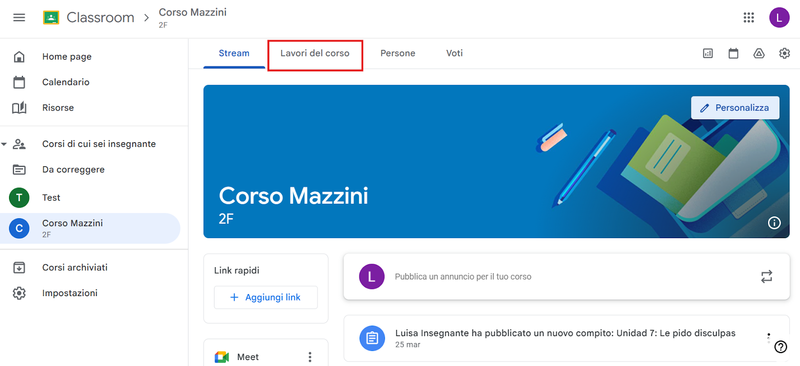 Ora, entra su una delle tue classi su Google Classroom e segui questi passi: