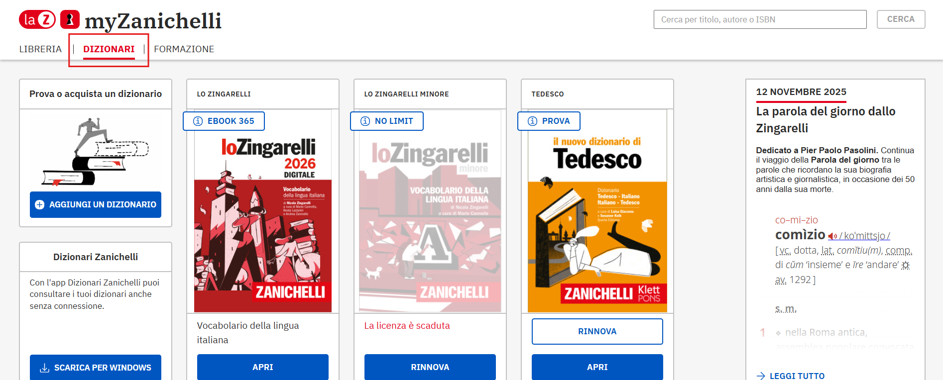 Per consultare i dizionari digitali Zanichelli, entra in myZanichelli con le tue credenziali e clicca su “Dizionari” nel menu in alto.