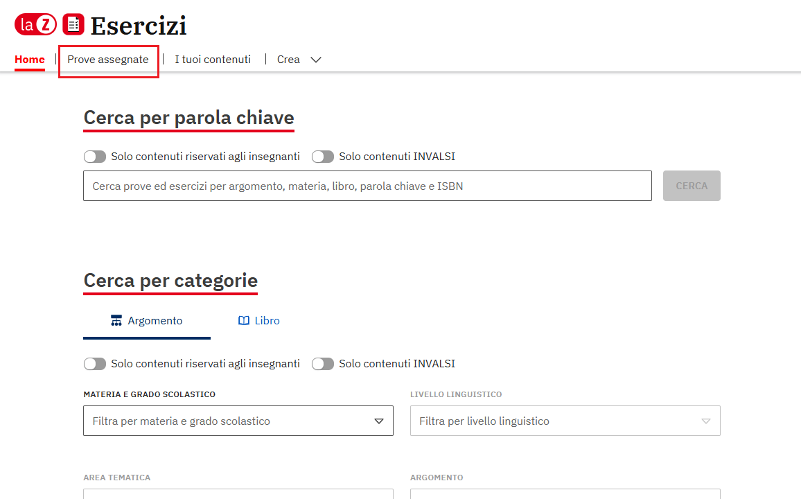 Dalla schermata di ricerca di laZ Esercizi, clicca su Prove assegnate.
