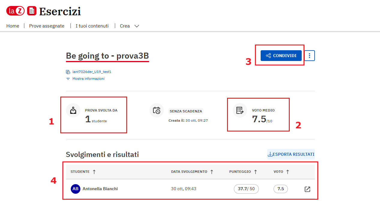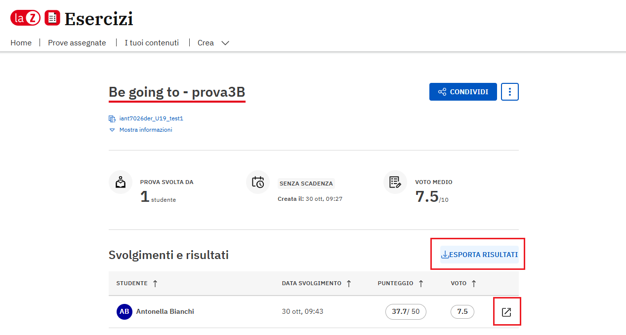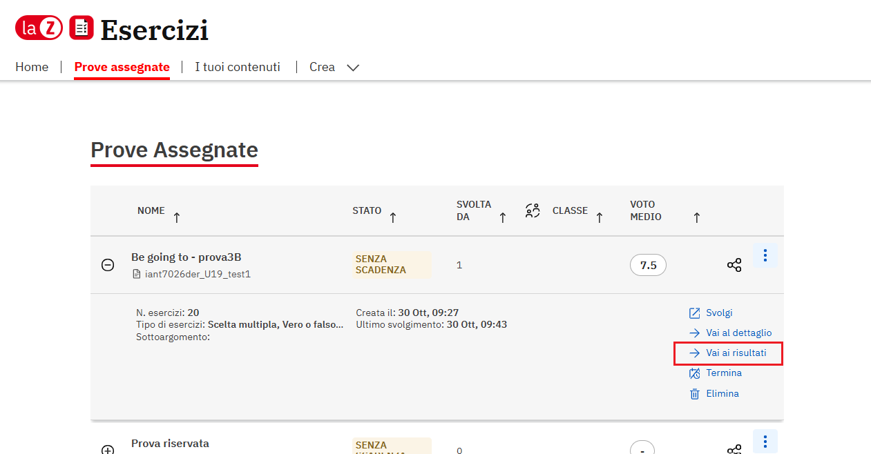 Si aprirà l’elenco delle prove assegnate da te. Clicca sulla prova che ti interessa e su Vai ai risultati.